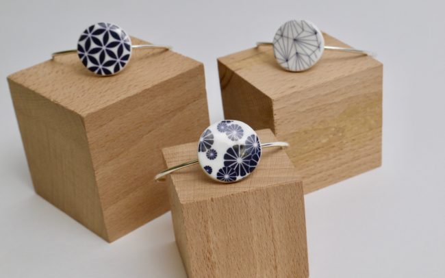 Nous travaillons également la porcelaine, que nous déclinons en bijoux et en petits contenants utilitaires. Le tout est orné de motifs chromographiés.